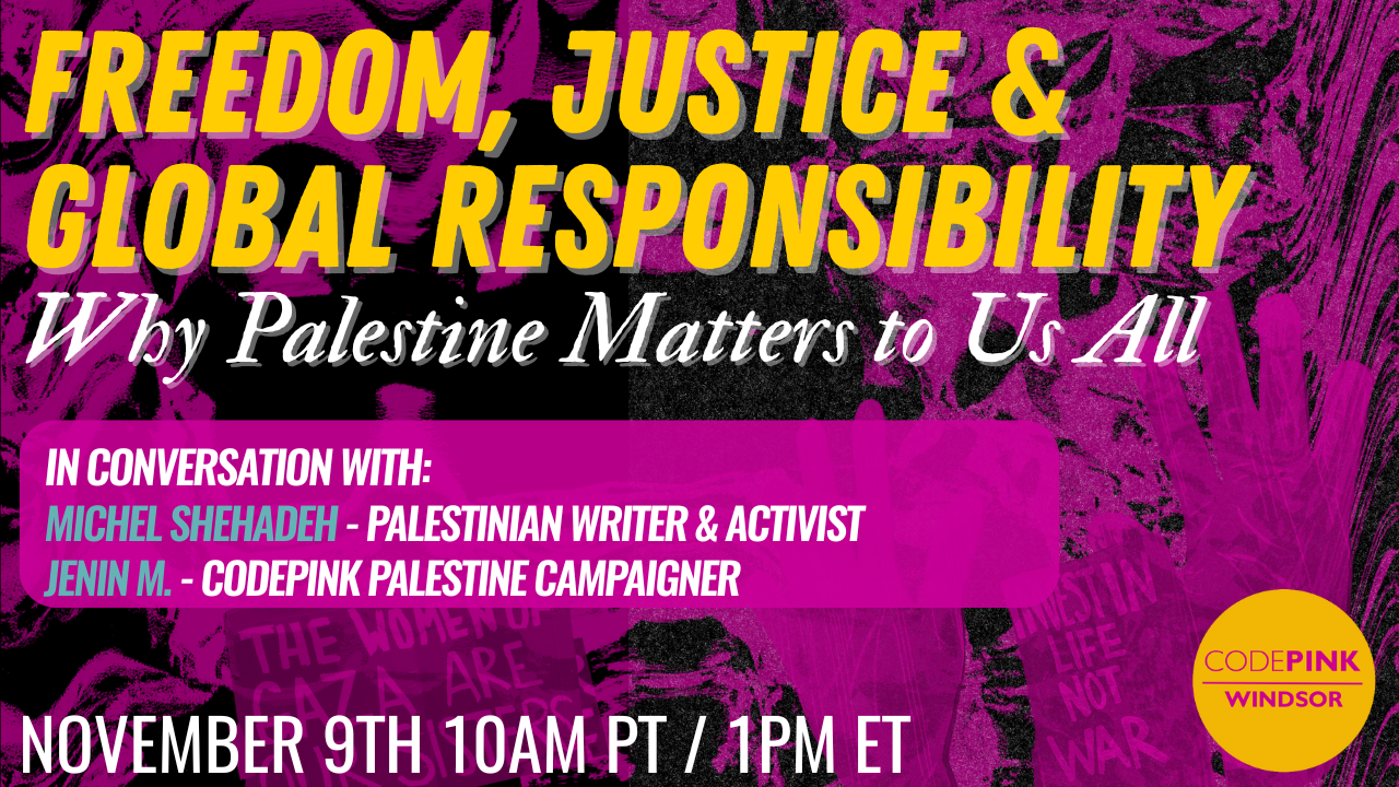 Join us November 9th at 10am PT / 1pm ET for a special webinar featuring Palestinian writer & activist Michel Shehadeh and Jenin. M, CODEPINK's Palestine Campaigner!